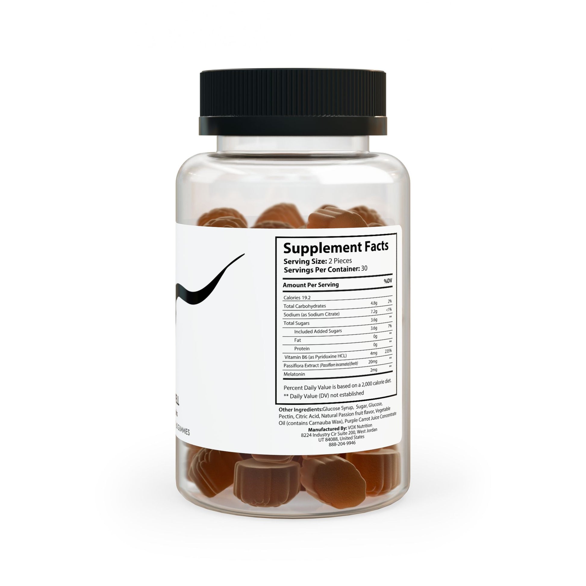 Ingredients: Sodium (as Sodium Citrate), Vitamin B6 (as Pyridoxine HCL), Passiora Extract (Passiore incarnata)(herb), Melatonin. Other Ingredients: Glucose Syrup, Sugar, Glucose, Pectin, Citric Acid, Natural Passion fruit avor, Vegetable Oil (contains Carnauba Wax), Purple Carrot Juice Concentrate